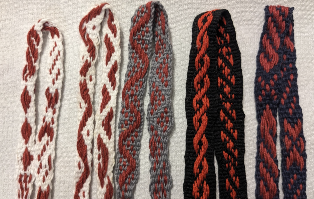 I then came across tablet weaving (also known as card weaving), which allows a greater variety of possiblities. There are a lot of patterns available on Pinterest, and there are some great videos (e.g. Lady Elewys).
